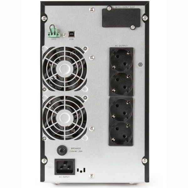 Alto factor de potencia de salida (FP=0,9) para garantizar la disponibilidad a todo tipo de cargas. Control total a través de la información de estado vía display LCD y teclado. Además de amplias opciones de monitorización y comunicación mediante el interface USB HID incorporado, el slot inteligente para tarjetas de comunicación SNMP o relés y un amplio abanico de paquetes de softwares disponibles; versión gratuita de monitorización descargable para Windows, Linux, Unix o Mac y paquetes disponibles para multiservidores o sistemas virtualizados. Para aquellas instalaciones que requieran mayor tiempo de back-up existe la posibilidad de ampliaciones de autonomía mediante SAIs con cargador extra y módulos adicionales de baterías. Destacar también la posibilidad de funcionamiento Eco-mode para mejorar la eficiencia del equipo, o las funcionalidades EPO (paro de emergencia), funcionamiento como convertidor de frecuencia y el test de baterías incorporado.