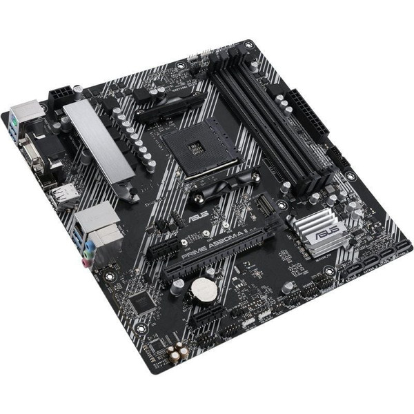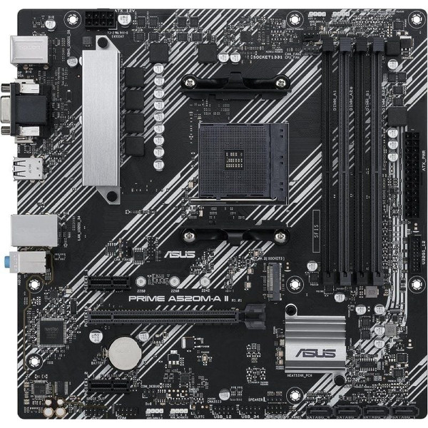 ASUS PRIME A520M-A II/CSM. Fabricante de procesador: AMD, Socket de procesador: Zócalo AM4, Procesador compatible: AMD Ryzen™ 3, AMD Ryzen™ 5. tipos de memoria compatibles: DDR4-SDRAM, Memoria interna máxima: 128 GB, Tipo de ranuras de memoria: DIMM. Interfaces de disco de almacenamiento soportados: M.2, SATA III, Tipos de unidades de almacenamiento admitidas: HDD & SSD, Niveles RAID: 0, 1, 10. Conector USB: USB tipo A. Tipo de interfaz ethernet: Gigabit Ethernet