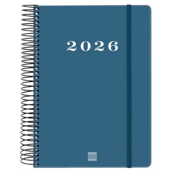 Agenda de espiral de estilo moderno y universal con tapa dura de cartón forrado con peliculado mate antirrayaduras. Ideal para uso personal y/o profesional. Con goma elástica. Esquinas microperforadas para localizar rápidamente el día/semana en curso. Contiene información de interés en la anualidad y otros contenidos extra. Formato similar a DIN A5 con las ventajas de una agenda portable y una de sobremesa. Duración: Enero 2026 - Diciembre 2026 (12 meses). Interior: 1 Día Página. Amplio espacio de escritura para cada día. Con horas. Sábados y domingos en página completa. Con información de los festivos de España. La anualidad de la agenda incluye la información relativa a: onomástica, festivos nacionales, cambios de estación e inicios de los años nuevos chino, musulmán, ortodoxo y hebreo. La agenda dispone también de otros contenidos extra: datos personales, horarios, calendarios, planificación anual del año y del año siguiente, festivos internacionales, cómo buscar en Google, usos del teclado, mapa de Europa y de los husos horarios, hojas para notas y hojas para teléfonos, direcciones y e-mails. Idioma del artículo: español. Formato: E10 - 155x212 mm. Tapas de cartón forrado con peliculado mate antirrayaduras, espiral simple metálica y papel. 70 g/m². Papel FSC®.