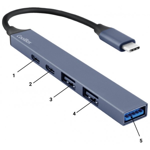 Conexión. USB Tipo C. Plug&Play. No requiere drivers.. Material: Aluminio, cable PVC. Dimensiones: 103,9 x 14,7 x 7,4 mm. Peso: 21,4 gramos. PUERTOS:. Puerto 1: USB-C (PD) Power delivery 2.0. Carga maxima de 100W. Puerto 2: USB-C (DATA USB2.0) Velocidad de transferencia max: 480Mbps. Puerto 3 y 4: USB-A (USB 2.0) Velocidad de transferencia max: 480Mbps. Puerto 5: USB-A (USB 3.2 Gen1) Velocidad de transferencia max: 5Gbps