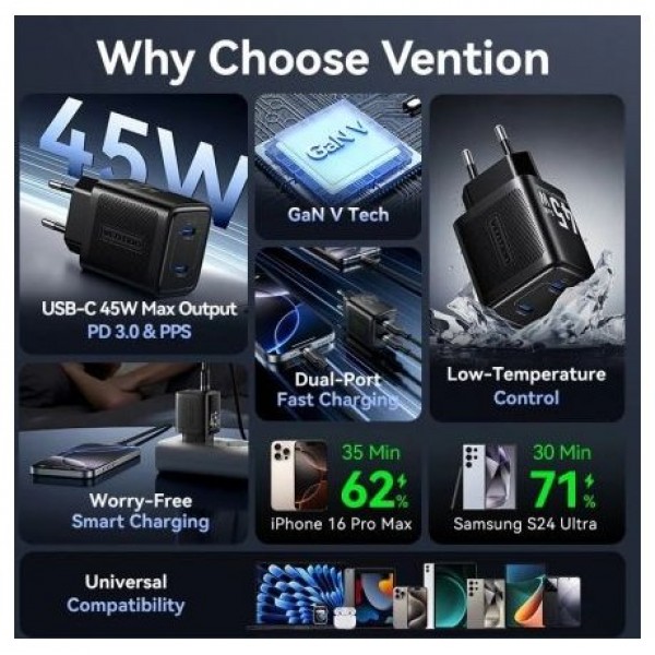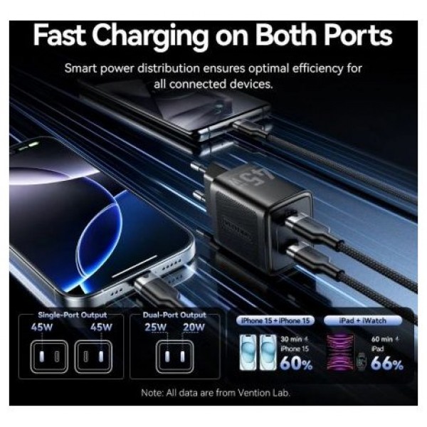 - Salida (USB-C1/C2): 5V⎓3A; 9V⎓3A; 12V⎓3A; 15V⎓3A; 20V⎓2,25A (45W máx.)