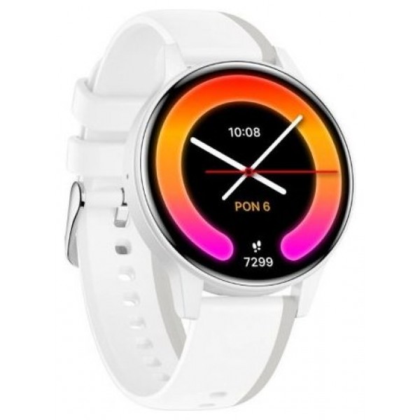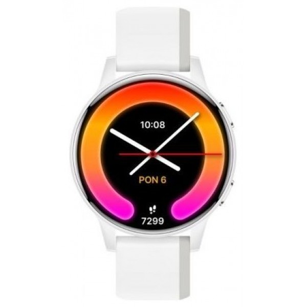 - Funciones: Hora y fecha, monitor de frecuencia cardíaca, modos deportivos, monitoreo del sueño, contador de calorías, clima, recordatorio de inactividad, historial de actividades, podómetro, recordatorio de hidratación, notificaciones, cronómetro/temporizador, calendario menstrual, cambio de esfera, encontrar reloj/teléfono, directorio telefónico, llamadas telefónicas, notificaciones SMS, visualización de notificaciones, iluminación con movimiento de muñeca, control de música, cámara remota, calculadora, altavoz, conversaciones BT