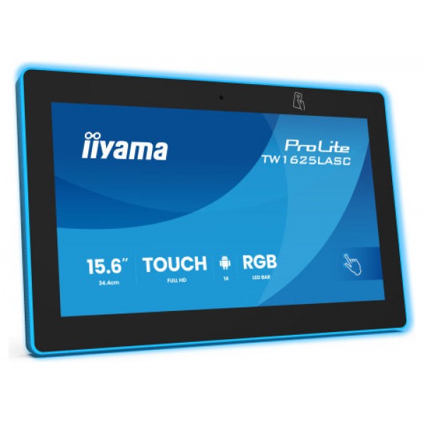 IIYAMA 15,6" RGB LED-LIGHTBAR PANEL-PC ANDROID 14+GMS, SOC OCTA-CORE RK3576 4GB, 32GB, 10-POINTS TOUCH, 1920X1080, IPS , SPEAKERS, MIC, CAMERA 5MP, NFC, RFID, POE, WIFI6E, BT5.3, SD SLOT, 390CD/M2, CABLE COVER, IISIGNAGE2 SUPPORTED (TW1625LASC-B3PNR)
