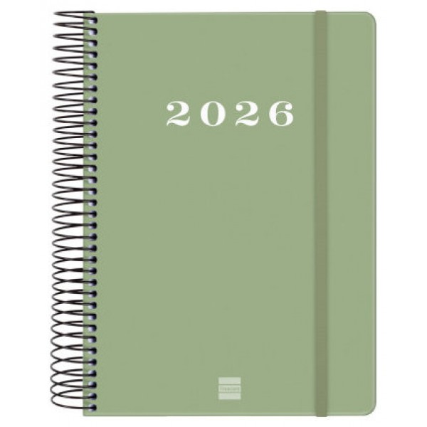 Agenda de espiral de estilo moderno y universal con tapa dura de cartón forrado con peliculado mate antirrayaduras. Ideal para uso personal y/o profesional. Con goma elástica. Esquinas microperforadas para localizar rápidamente el día/semana en curso. Contiene información de interés en la anualidad y otros contenidos extra. Formato similar a DIN A5 con las ventajas de una agenda portable y una de sobremesa. Duración: Enero 2026 - Diciembre 2026 (12 meses). Interior: 1 Día Página. Amplio espacio de escritura para cada día. Con horas. Sábados y domingos en página completa. Con información de los festivos de España. La anualidad de la agenda incluye la información relativa a: onomástica, festivos nacionales, cambios de estación e inicios de los años nuevos chino, musulmán, ortodoxo y hebreo. La agenda dispone también de otros contenidos extra: datos personales, horarios, calendarios, planificación anual del año y del año siguiente, festivos internacionales, cómo buscar en Google, usos del teclado, mapa de Europa y de los husos horarios, hojas para notas y hojas para teléfonos, direcciones y e-mails. Idioma del artículo: español. Formato: E10 - 155x212 mm. Tapas de cartón forrado con peliculado mate antirrayaduras, espiral simple metálica y papel. 70 g/m². Papel FSC®.