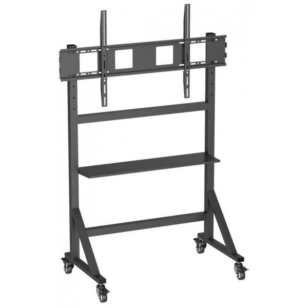 Incluye sistema de ajuste de altura para adaptar la pantalla al ángulo de visión deseado, ya sea sentado o de pie. Incorpora un estante fijo con capacidad de hasta 20 kg para reproductores multimedia, consolas o accesorios AV, ayudando a mantener la configuración organizada.