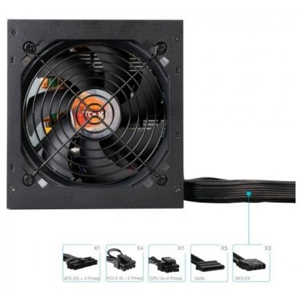 - Conectores: 1 conector ATX (24 pines) - longitud exterior 550 mm, 1 conector CPU (P8 4+4 pines) - longitud exterior 600 mm, 4 conector PCI-E (P8 6+2 pines) - longitud exterior 550+150 mm, 5 conectores SATA y 3 MOLEX - longitud exterior 550+150+150+150 mm